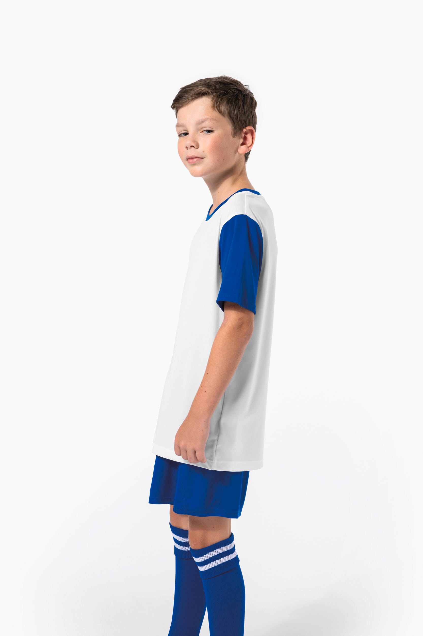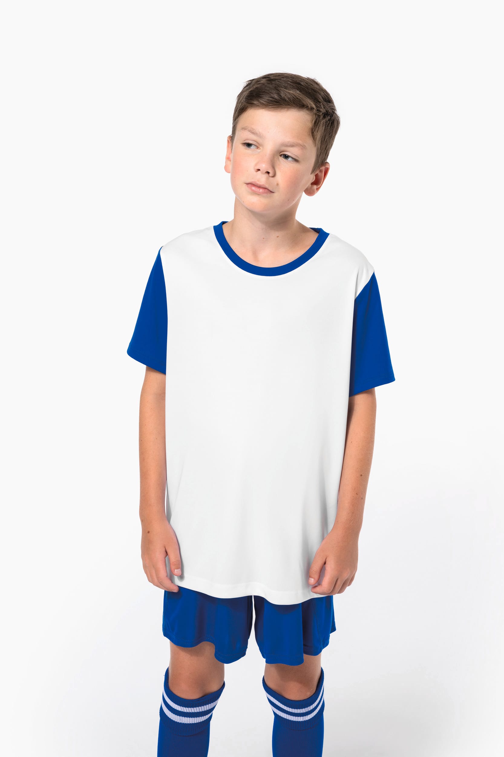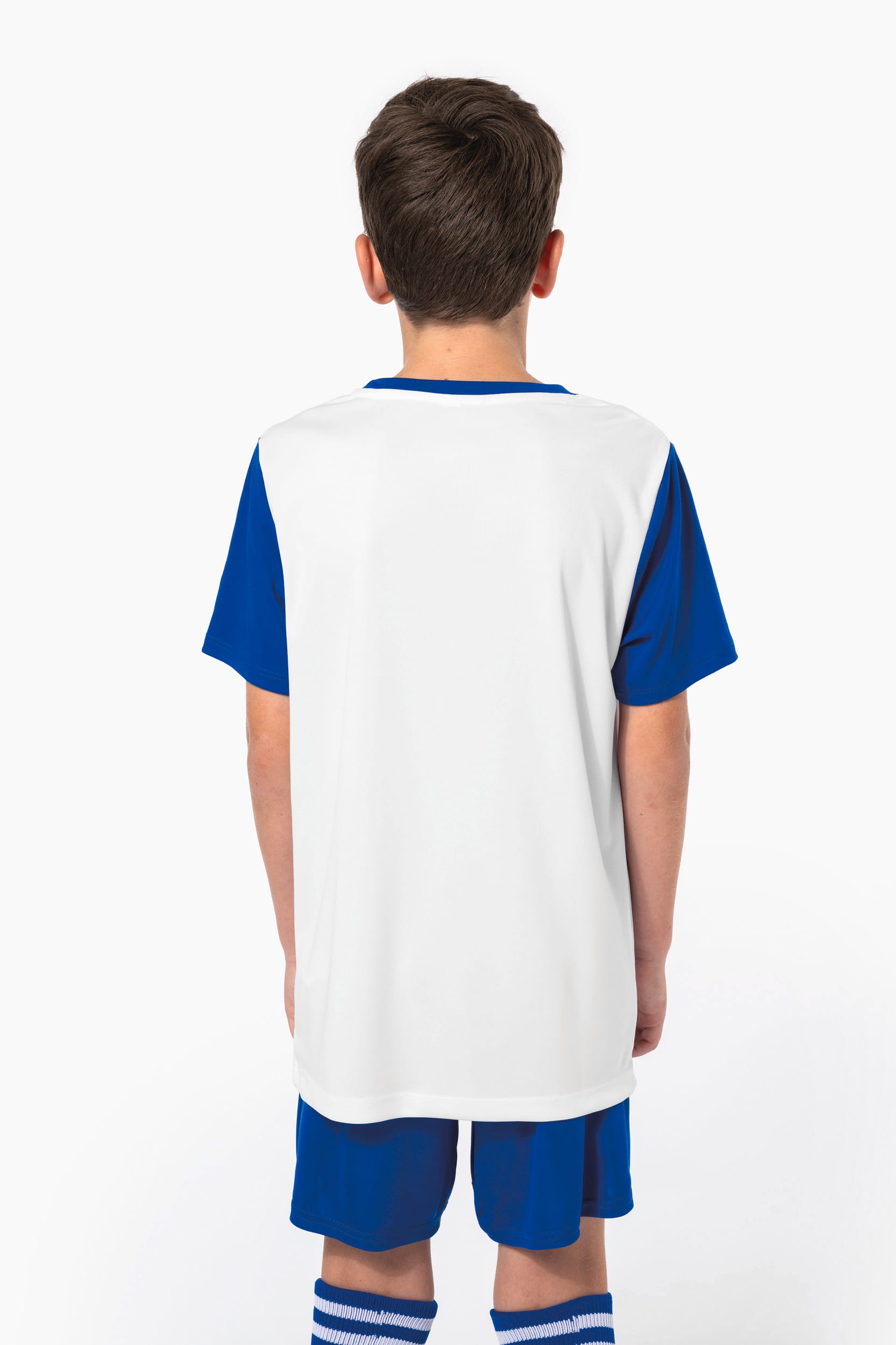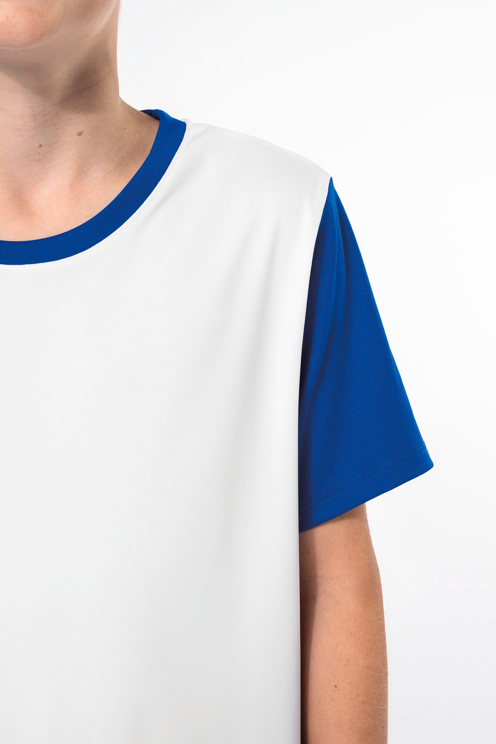 100% polyester. Maille interlock. Coupe droite. Encolure ronde contraste et bande de propret. Manches droites contrastes. Finitions double aiguille au bas de manches et de vtement.